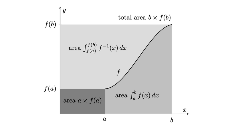 \[\int_{f(a)}^{f(b)} f^{-1}(y) \, dy + \int^{b}_a f(x) \, dx = bf(b)-af(a)\]This is a result by Laisant in 1905. Here’s a proof-without-words.