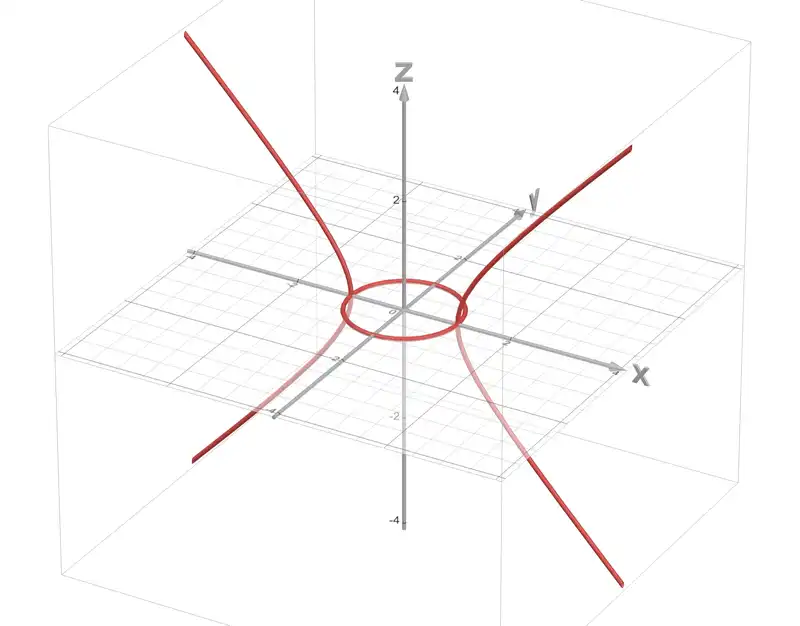 Case 1 nets us a hyperbola in the \(xz\)-plane. Case 2 nets us a unit circle in the \(xy\)-plane.